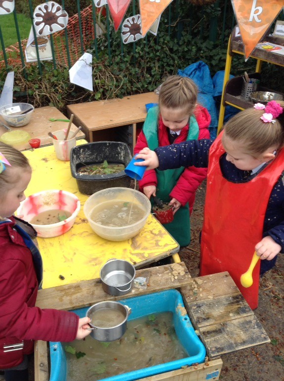 In our Outdoor play we have been busy making Obstacle courses and using the crates to make houses and dens. The children have enjoyed looking for snails and other mini beasts in the garden area and also cooking some lovely ‘porridge’ in the mud kitchen. The children have also loved performing on our stage and using the musical instruments and dressing up box.