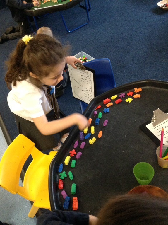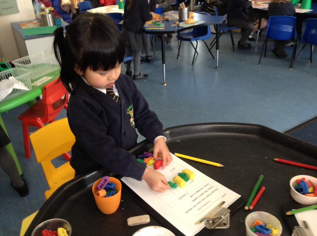 In Maths we have been working hard on our counting and number recognition in preparation for F2. We have also been sorting objects by size and making our own repeating patterns.
