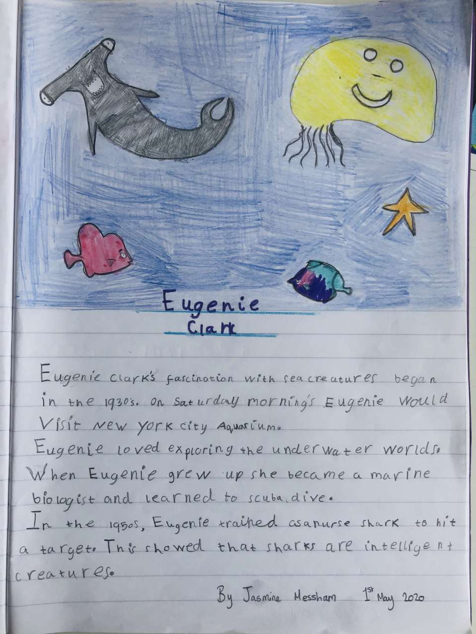 Some more brilliant home learning this time from the children in year 1.  They have been finding out Eugenie Clark and the fascinating underwater creatures, producing magnificent artwork in the style of Kadinsky, finding out about old toys by asking Grandparents what they used to play with in the 1960s